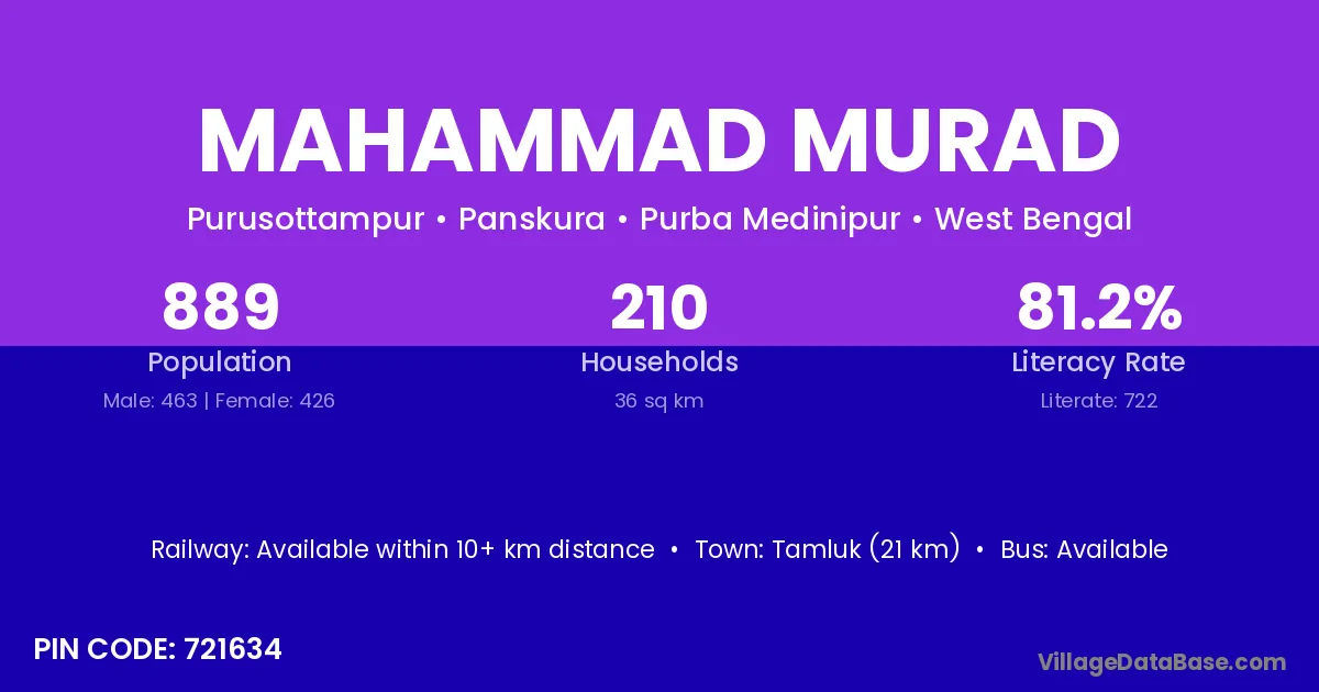 Tamluk (21 km) is the nearest town to Mahammad Murad village for major economic activities and is located approximately 21 km away.