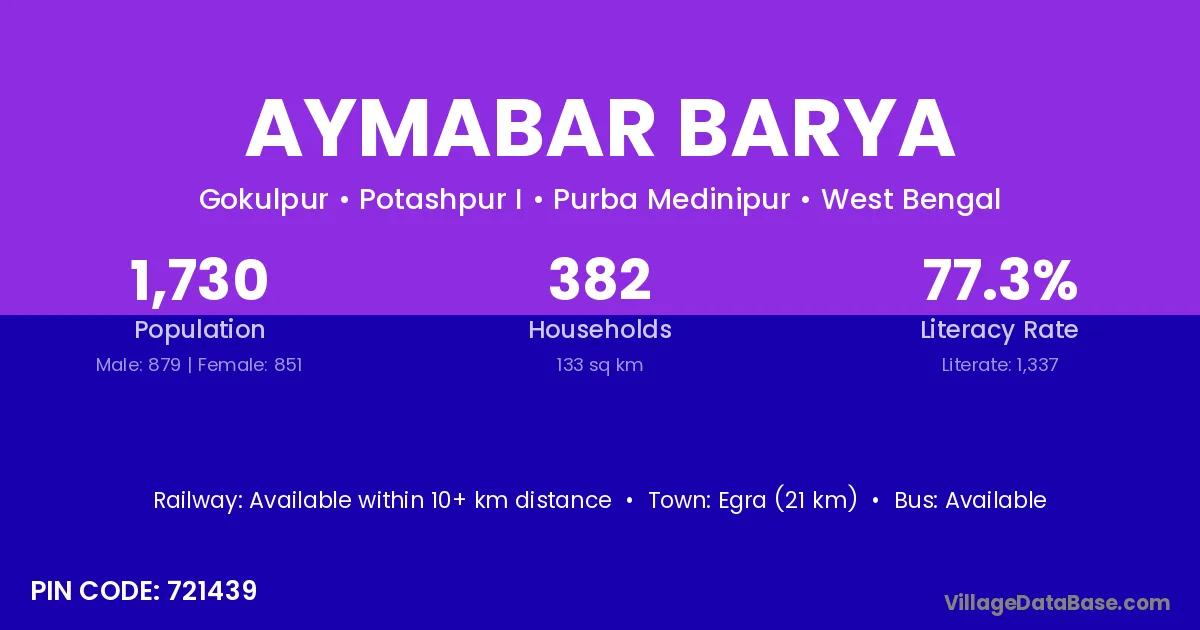 Egra (21 km) is the nearest town to Aymabar Barya village for major economic activities and is located approximately 21 km away.