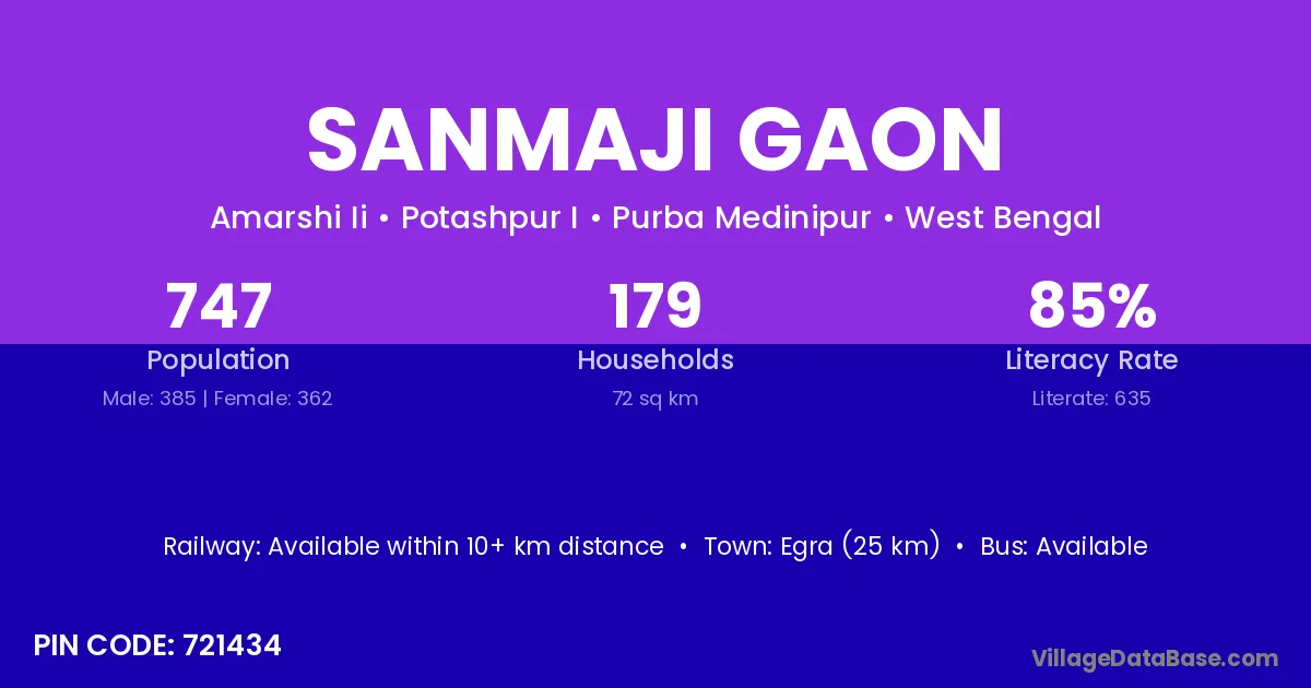 Egra (25 km) is the nearest town to Sanmaji Gaon village for major economic activities and is located approximately 25 km away.