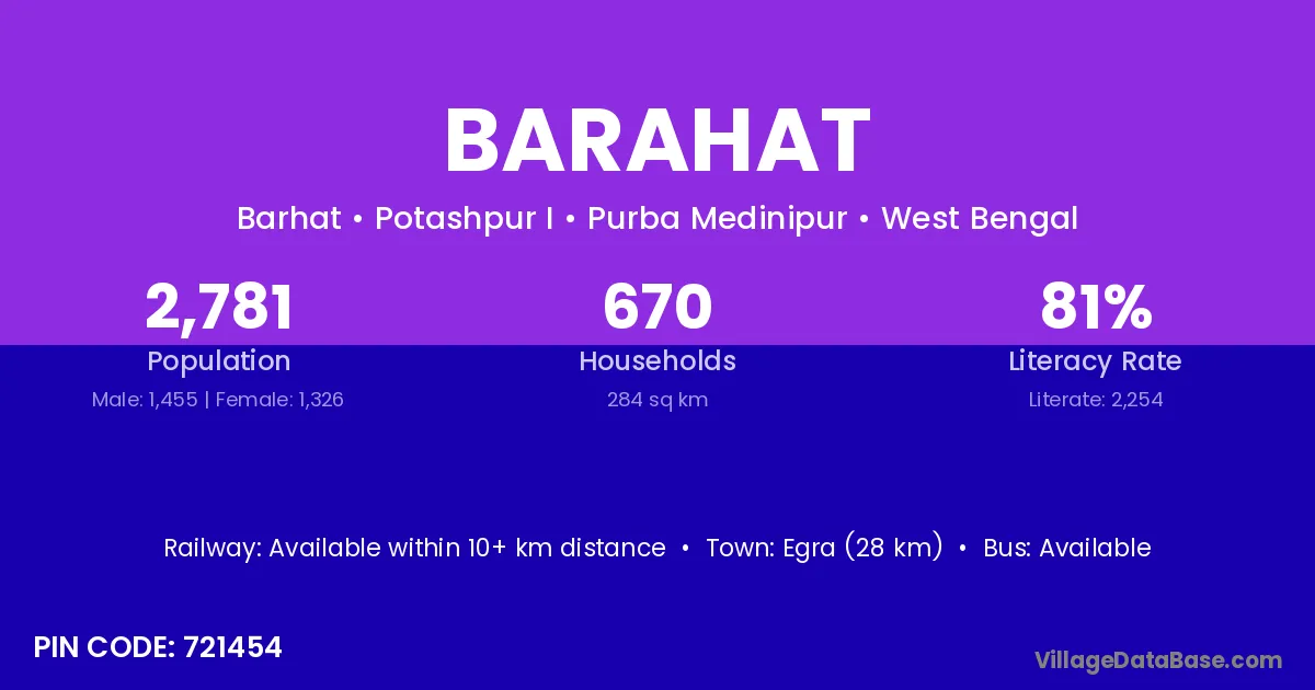 Egra (28 km) is the nearest town to Barahat village for major economic activities and is located approximately 28 km away.
