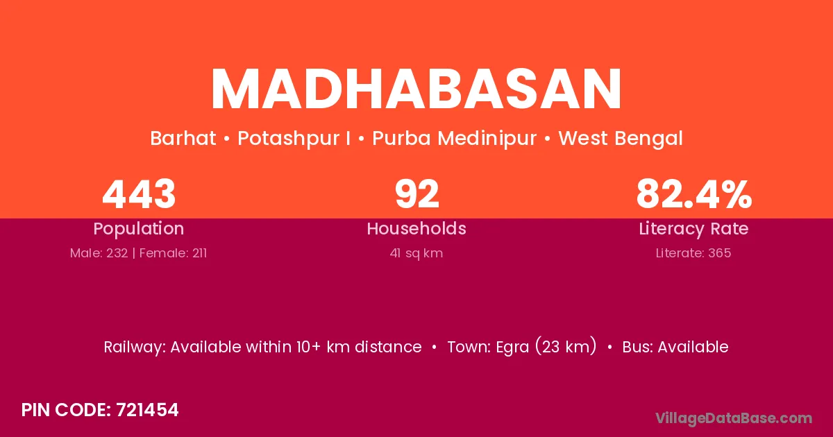 Egra (23 km) is the nearest town to Madhabasan village for major economic activities and is located approximately 23 km away.