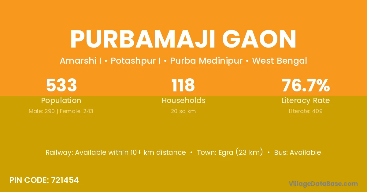Egra (23 km) is the nearest town to Purbamaji Gaon village for major economic activities and is located approximately 23 km away.