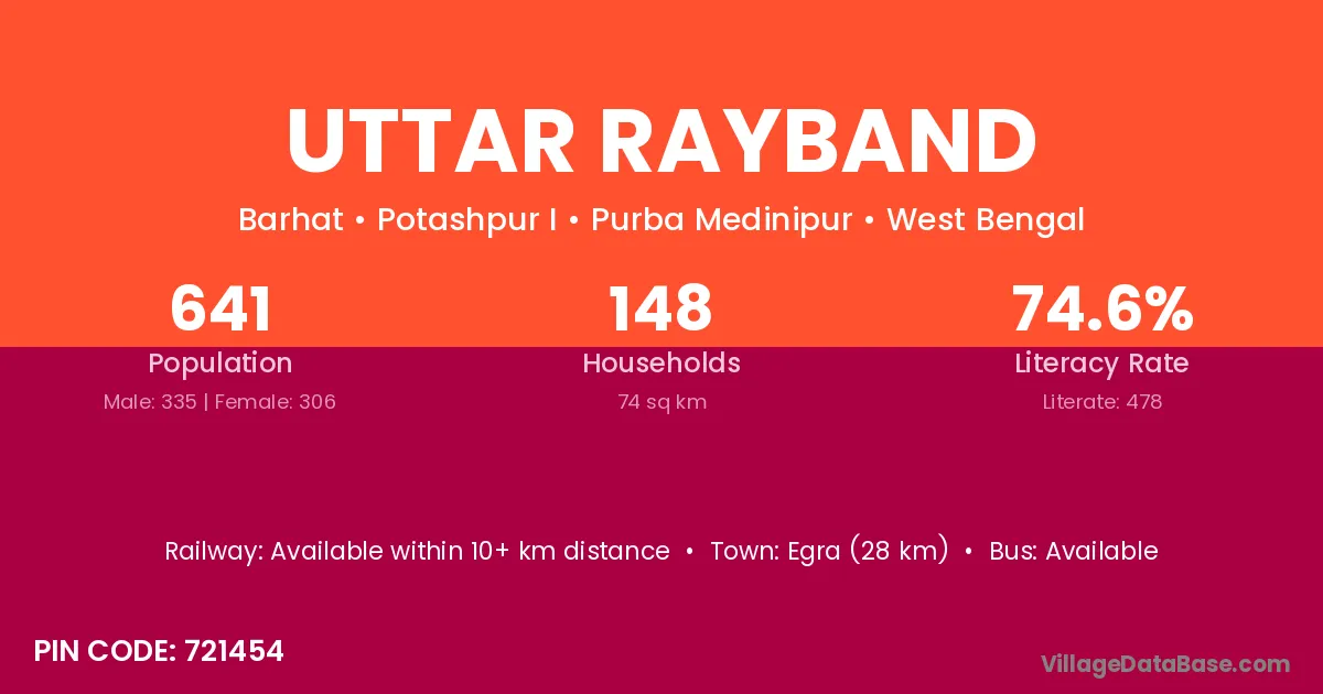 Egra (28 km) is the nearest town to Uttar Rayband village for major economic activities and is located approximately 28 km away.