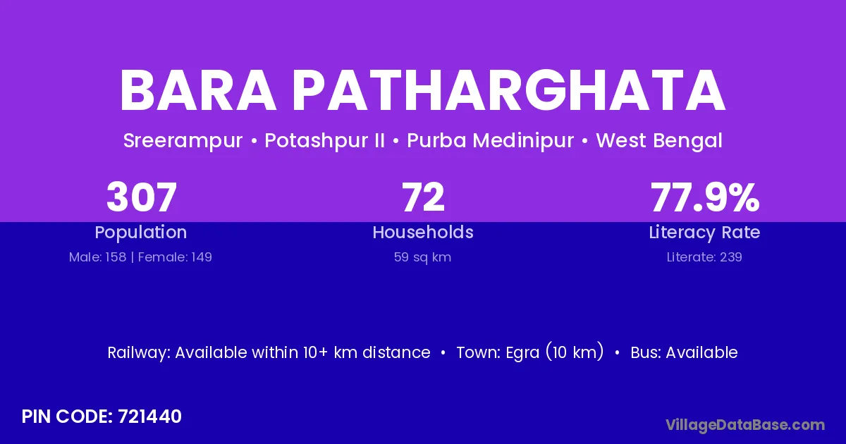Egra (10 km) is the nearest town to Bara Patharghata village for major economic activities and is located approximately 10 km away.
