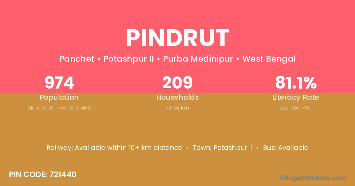 Pindrut village is located in the Potashpur II Subdivision of the Purba Medinipur district in West Bengal.
