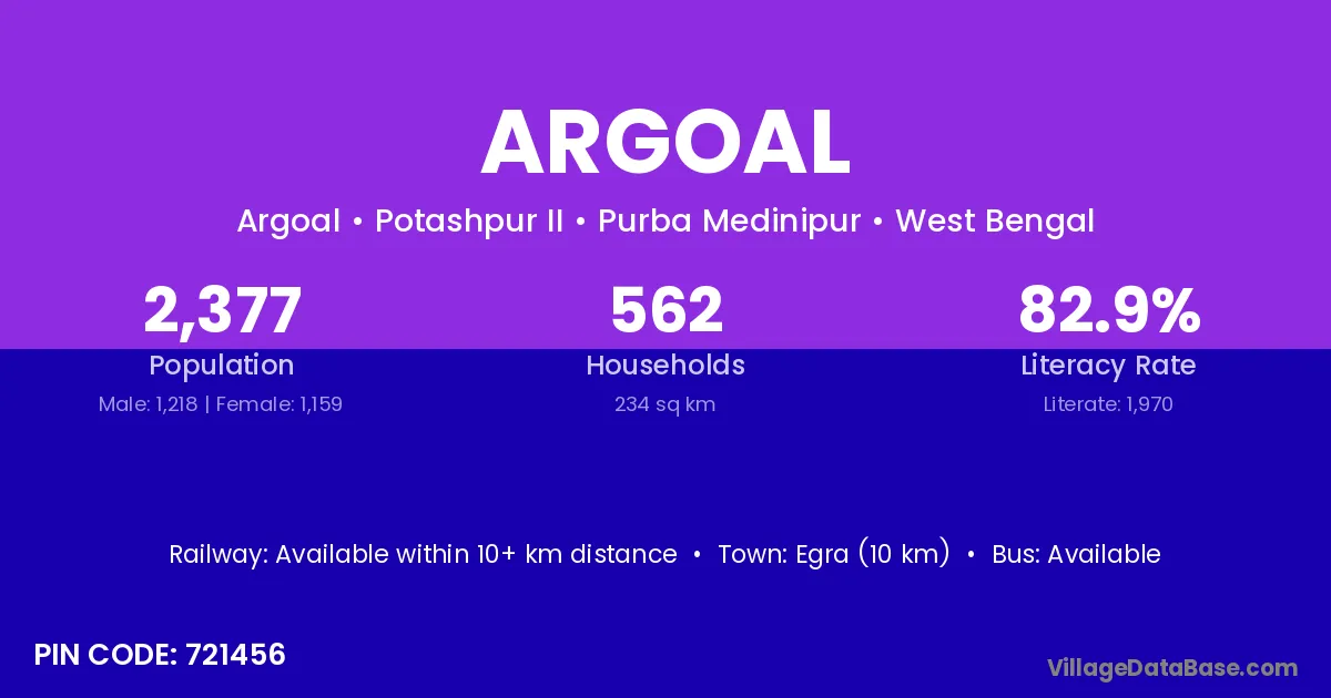 Egra (10 km) is the nearest town to Argoal village for major economic activities and is located approximately 10 km away.