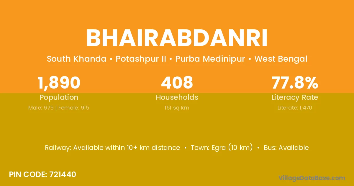 Egra (10 km) is the nearest town to Bhairabdanri village for major economic activities and is located approximately 10 km away.