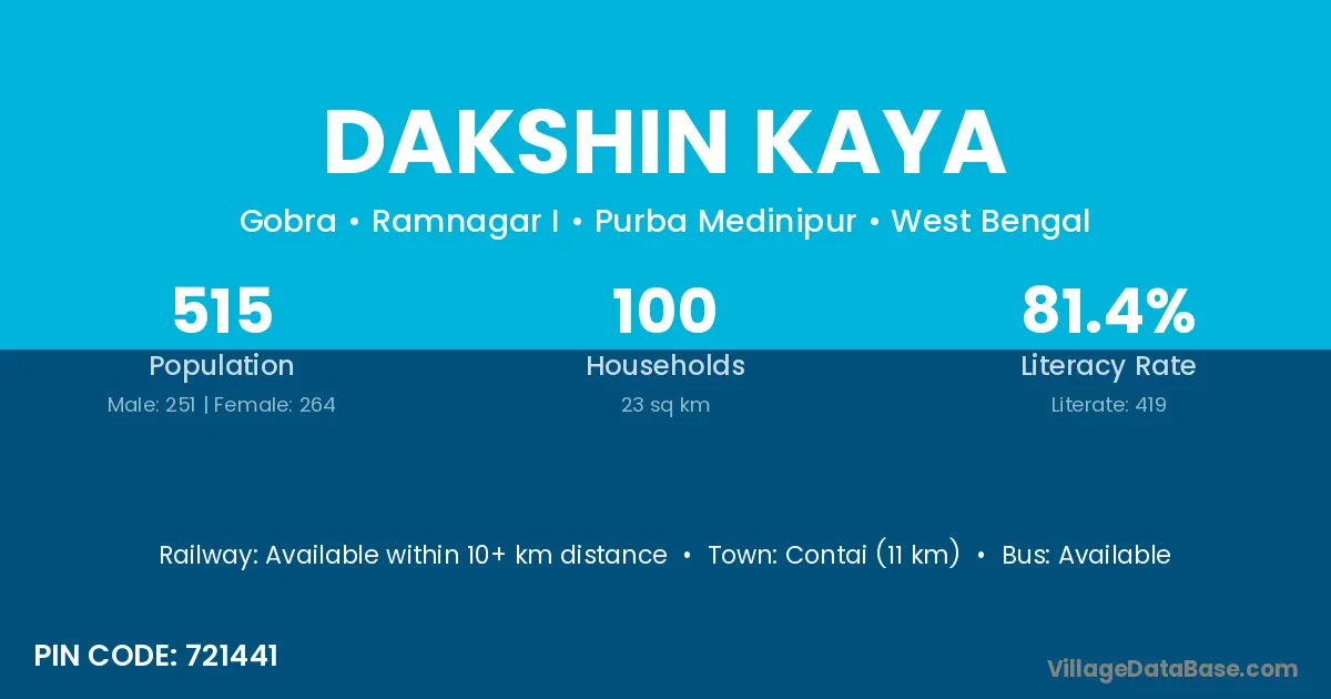 Contai (11 km) is the nearest town to Dakshin Kaya village for major economic activities and is located approximately 11 km away.