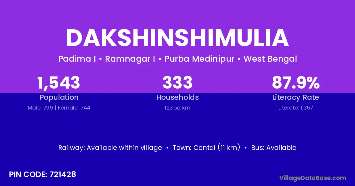 Contai (11 km) is the nearest town to Dakshinshimulia village for major economic activities and is located approximately 11 km away.