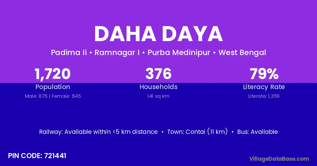Contai (11 km) is the nearest town to Daha Daya village for major economic activities and is located approximately 11 km away.