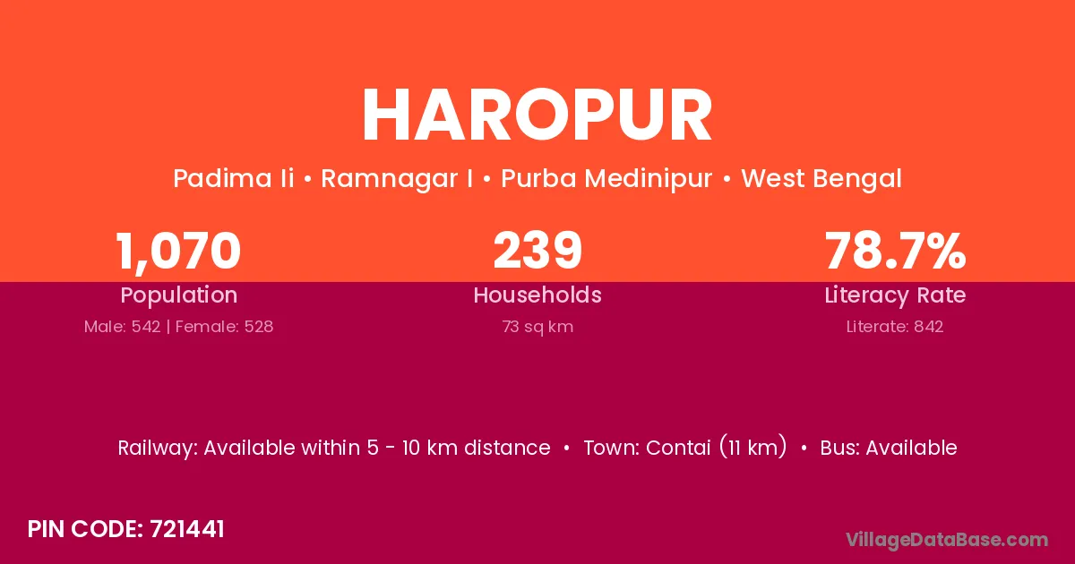 Contai (11 km) is the nearest town to Haropur village for major economic activities and is located approximately 11 km away.