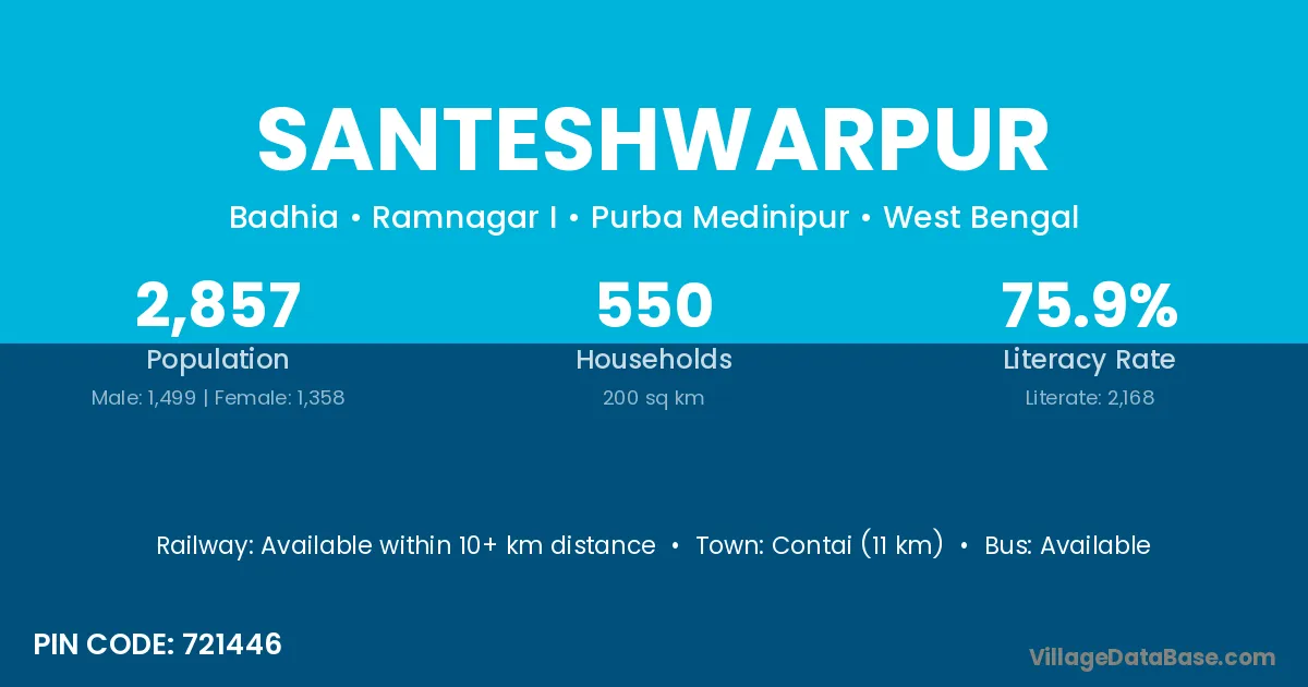 Contai (11 km) is the nearest town to Santeshwarpur village for major economic activities and is located approximately 11 km away.