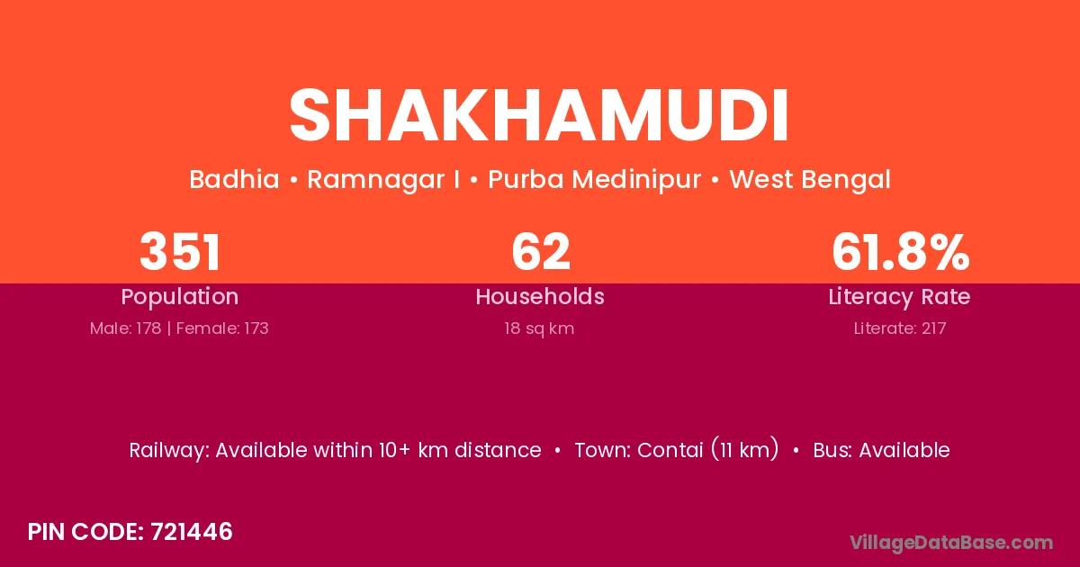 Contai (11 km) is the nearest town to Shakhamudi village for major economic activities and is located approximately 11 km away.