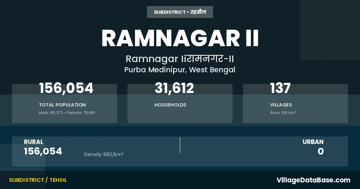 According to the 2011 census The total area of Ramnagar II Subdivision is 159 km², with a population of 156054 people. The population density is 982 inhabitants per square kilometre, and there are approximately 31612 houses in the sub district.