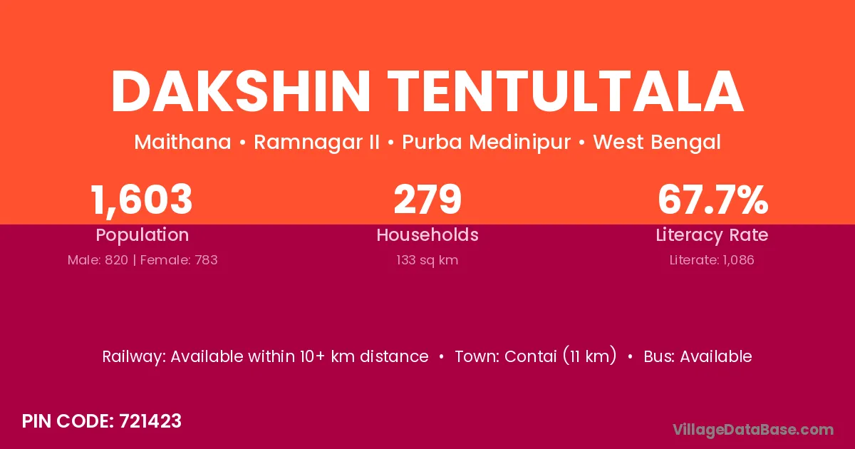 Contai (11 km) is the nearest town to Dakshin Tentultala village for major economic activities and is located approximately 11 km away.