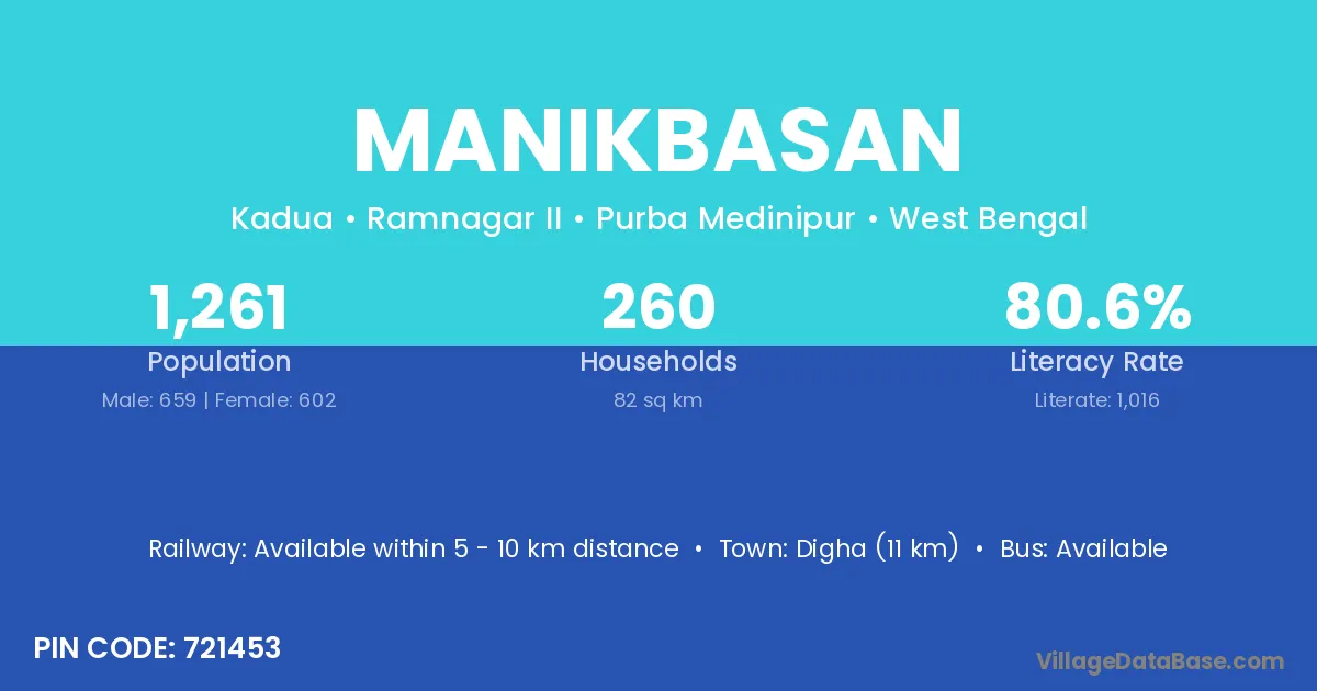 Digha (11 km) is the nearest town to Manikbasan village for major economic activities and is located approximately 11 km away.