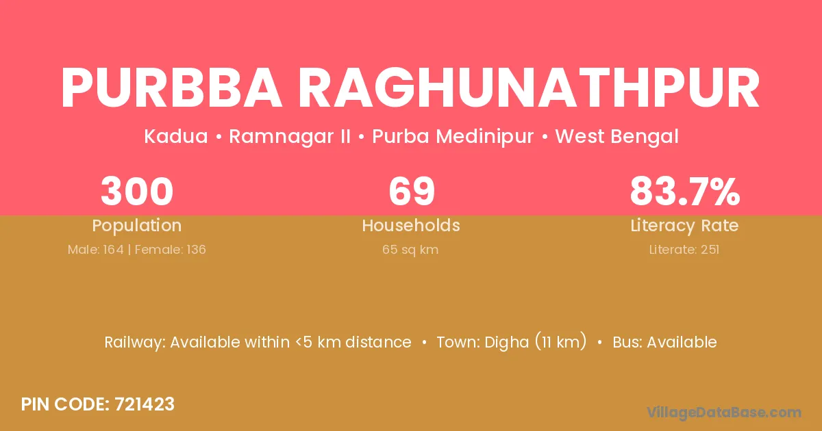 Digha (11 km) is the nearest town to Purbba Raghunathpur village for major economic activities and is located approximately 11 km away.