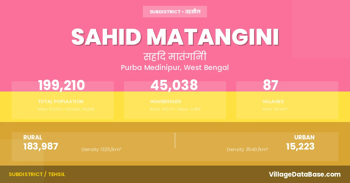 According to the 2011 census The total area of Sahid Matangini Subdivision is 143 km², with a population of 199210 people. The population density is 1,391 inhabitants per square kilometre, and there are approximately 45038 houses in the sub district.