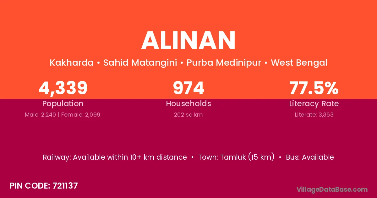 Tamluk (15 km) is the nearest town to Alinan village for major economic activities and is located approximately 15 km away.