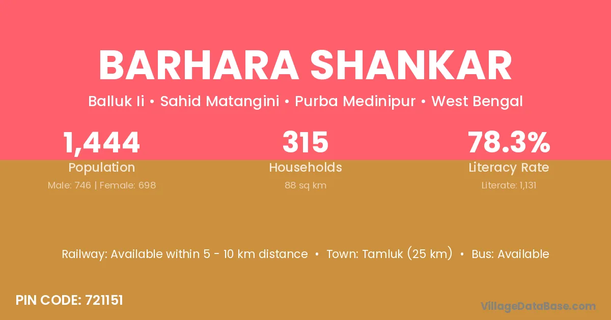 Tamluk (25 km) is the nearest town to Barhara Shankar village for major economic activities and is located approximately 25 km away.
