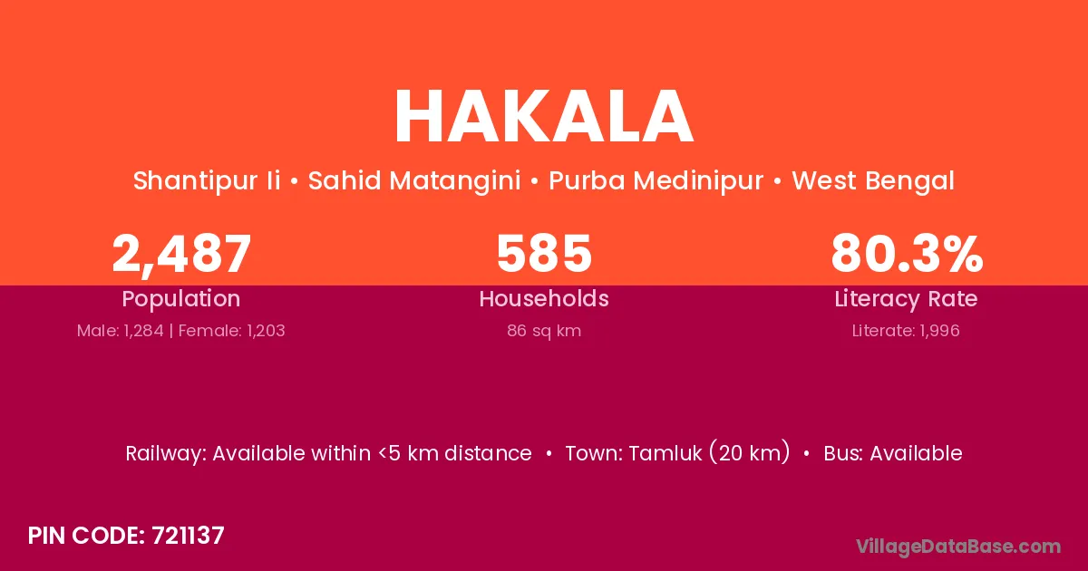 Tamluk (20 km) is the nearest town to Hakala village for major economic activities and is located approximately 20 km away.