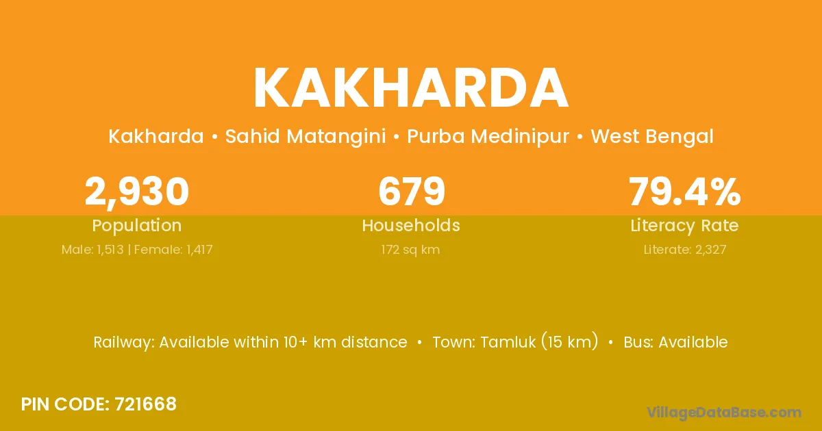 Tamluk (15 km) is the nearest town to Kakharda village for major economic activities and is located approximately 15 km away.