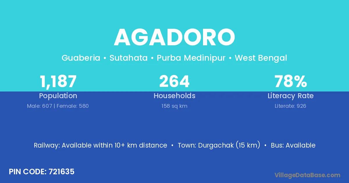 Durgachak (15 km) is the nearest town to Agadoro village for major economic activities and is located approximately 15 km away.