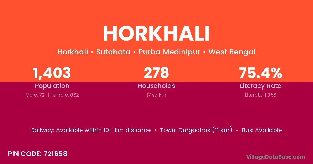 Horkhali village is located in the Sutahata Subdivision of the Purba Medinipur district in West Bengal.