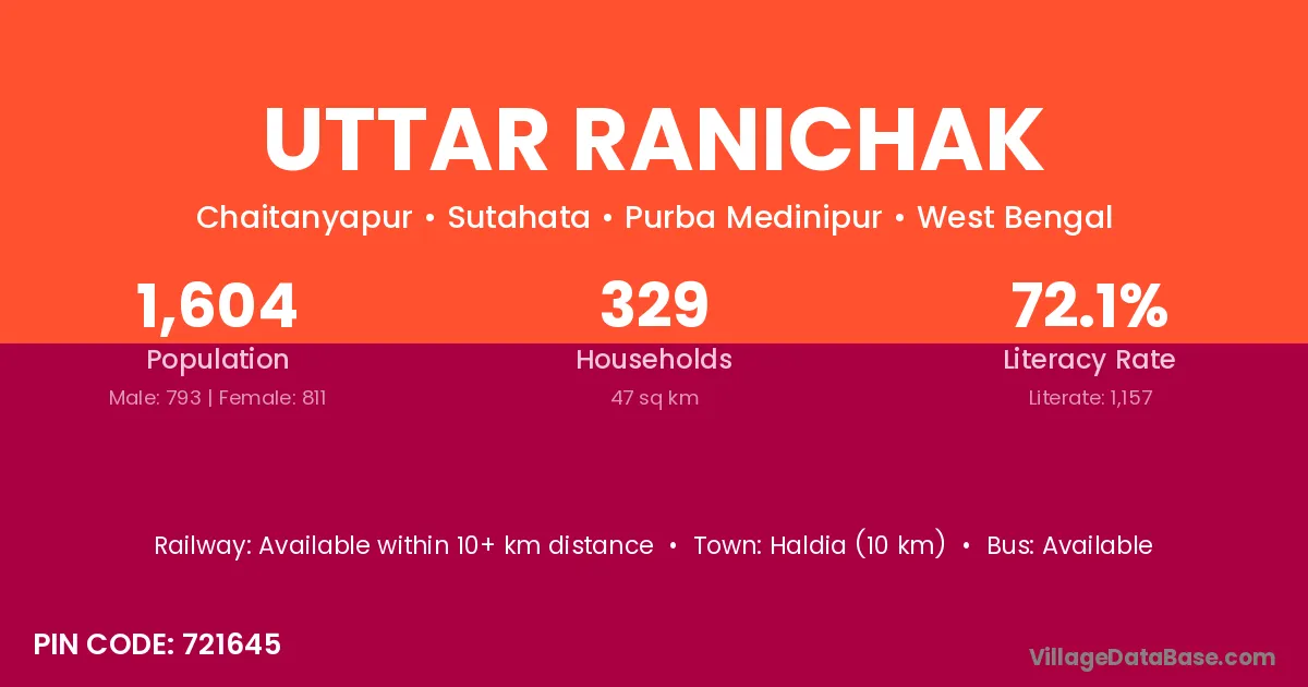 Haldia (10 km) is the nearest town to Uttar Ranichak village for major economic activities and is located approximately 10 km away.