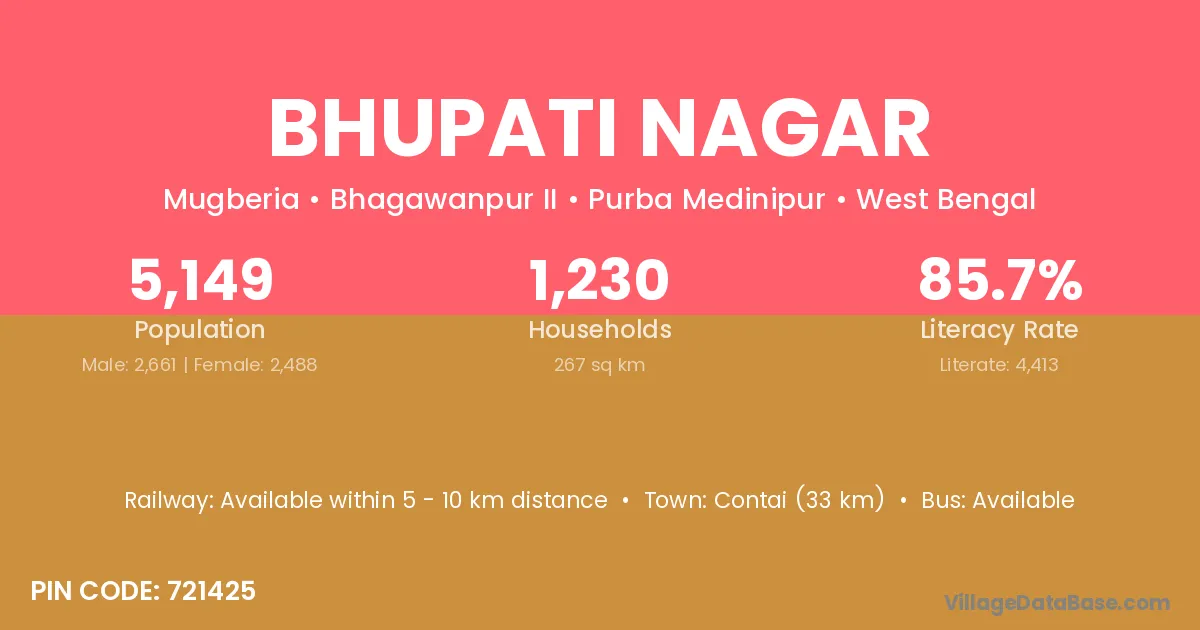 Durgachak (14 km) is the nearest town to Bhupati Nagar village for major economic activities and is located approximately 14 km away.