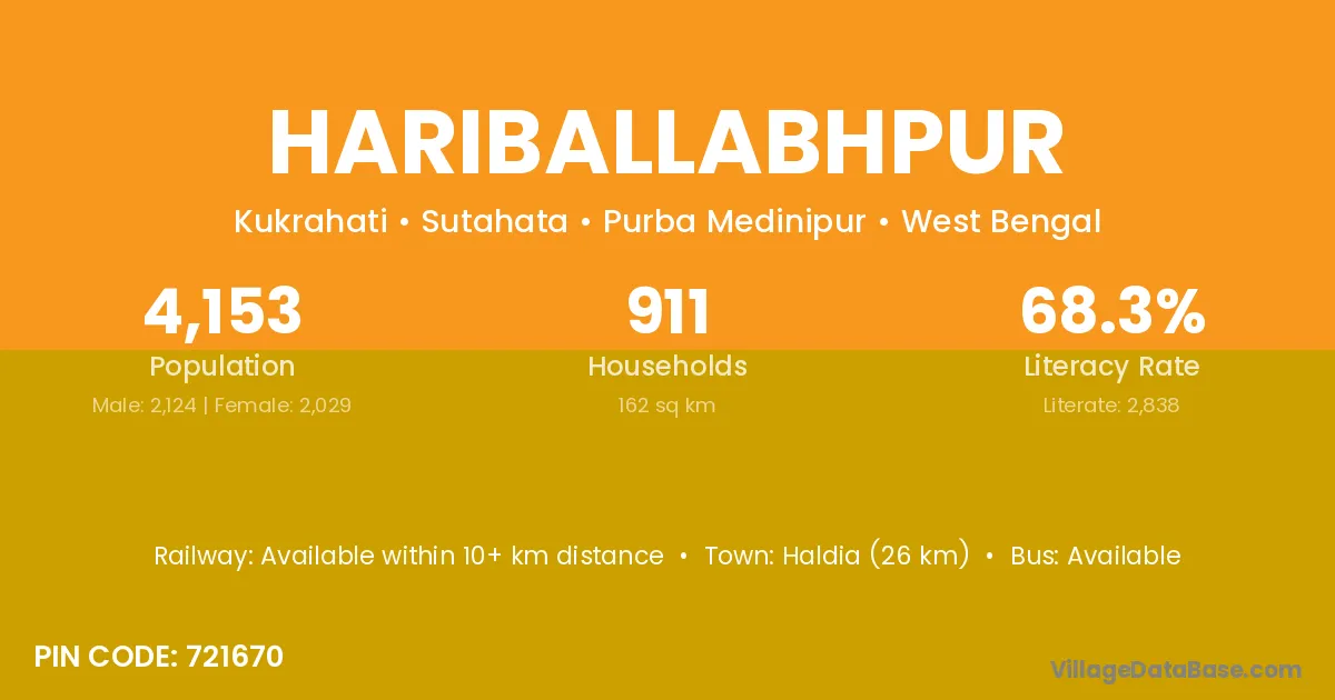 Haldia (26 km) is the nearest town to Hariballabhpur village for major economic activities and is located approximately 26 km away.