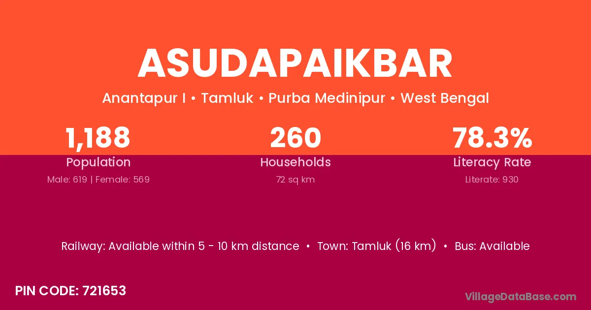 Tamluk (16 km) is the nearest town to Asudapaikbar village for major economic activities and is located approximately 16 km away.