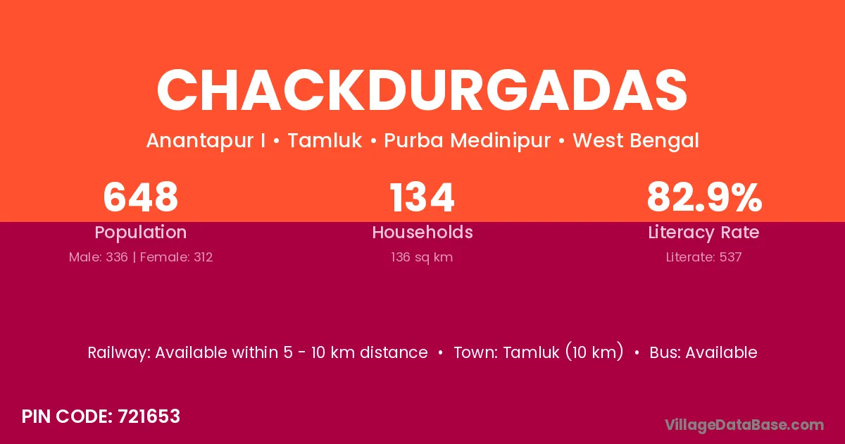 Tamluk (10 km) is the nearest town to Chackdurgadas village for major economic activities and is located approximately 10 km away.