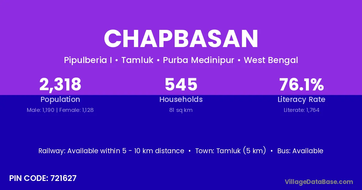 Tamluk (5 km) is the nearest town to Chapbasan village for major economic activities and is located approximately 5 km away.