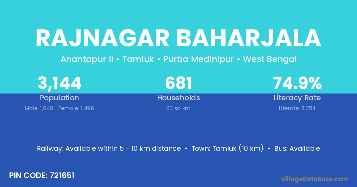 Tamluk (10 km) is the nearest town to Rajnagar Baharjala village for major economic activities and is located approximately 10 km away.