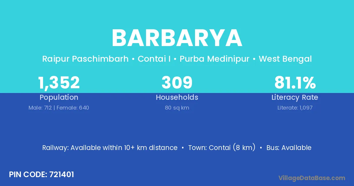 Tamluk (10 km) is the nearest town to Barbarya village for major economic activities and is located approximately 10 km away.
