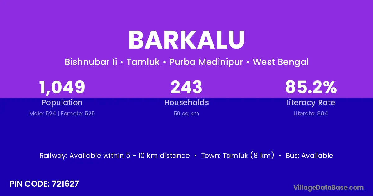 Tamluk (8 km) is the nearest town to Barkalu village for major economic activities and is located approximately 8 km away.