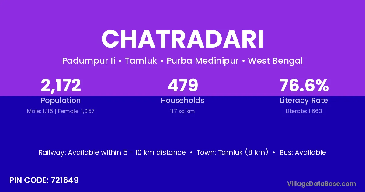 Tamluk (8 km) is the nearest town to Chatradari village for major economic activities and is located approximately 8 km away.