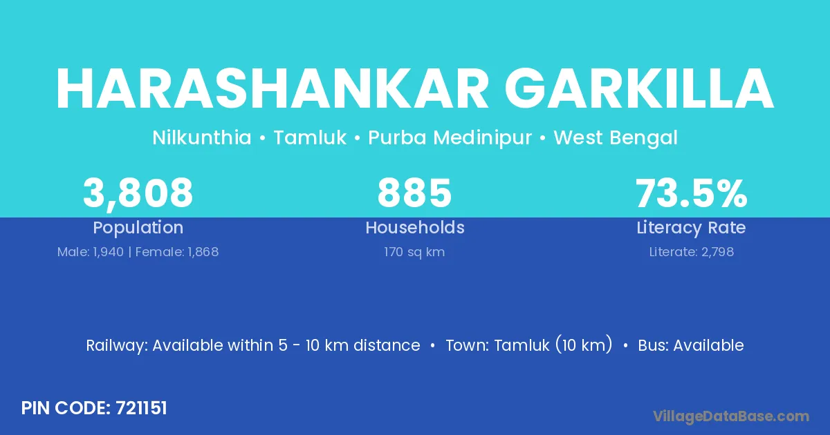 Tamluk (10 km) is the nearest town to Harashankar Garkilla village for major economic activities and is located approximately 10 km away.