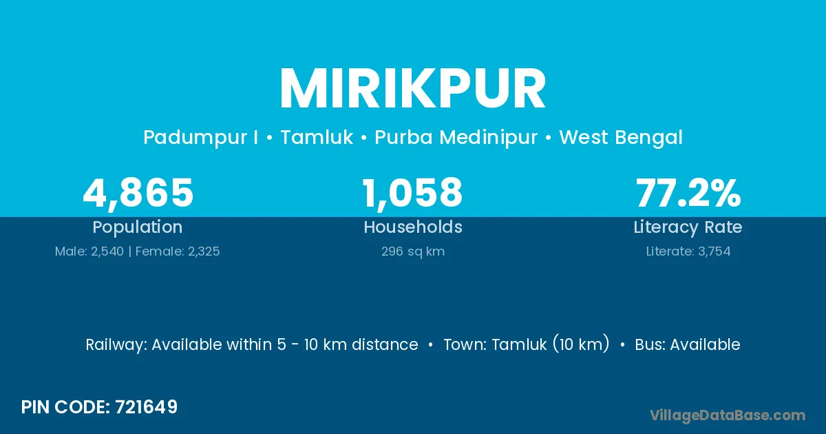 Tamluk (10 km) is the nearest town to Mirikpur village for major economic activities and is located approximately 10 km away.