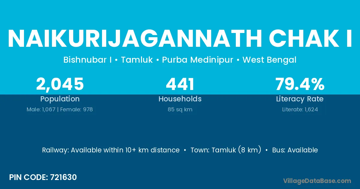 Tamluk (8 km) is the nearest town to Naikurijagannath Chak I village for major economic activities and is located approximately 8 km away.