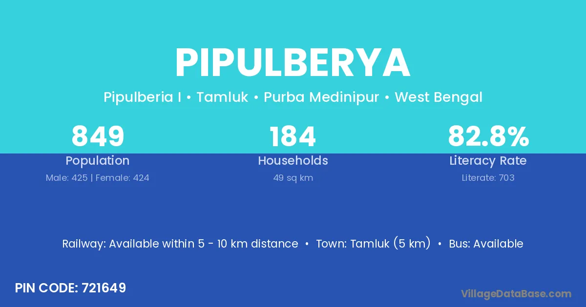 Tamluk (5 km) is the nearest town to Pipulberya village for major economic activities and is located approximately 5 km away.