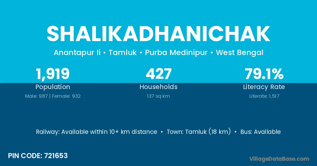 Tamluk (18 km) is the nearest town to Shalikadhanichak village for major economic activities and is located approximately 18 km away.