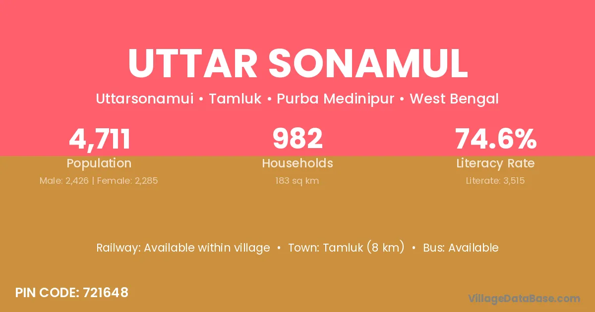 Tamluk (8 km) is the nearest town to Uttar Sonamul village for major economic activities and is located approximately 8 km away.