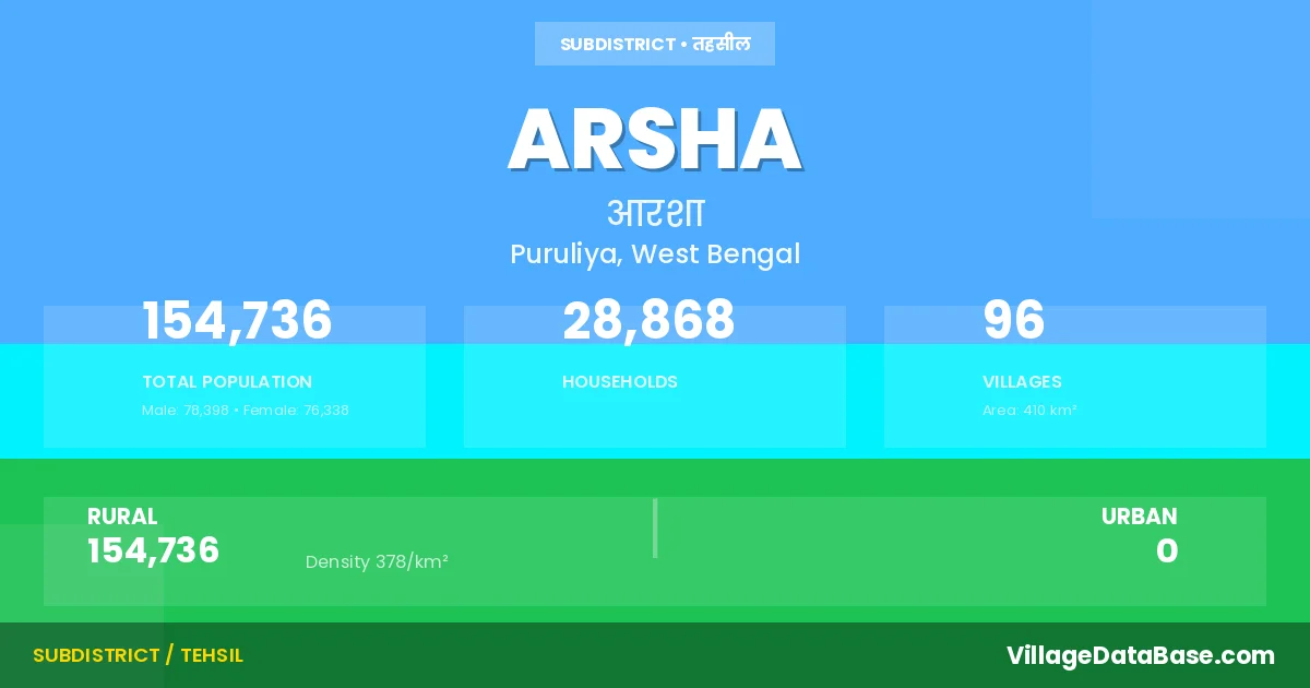 According to the 2011 census The total area of Arsha Subdivision is 410 km², with a population of 154736 people. The population density is 378 inhabitants per square kilometre, and there are approximately 28868 houses in the sub district.