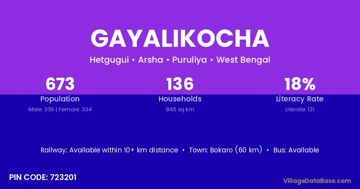Bokaro (60 km) is the nearest town to Gayalikocha village for major economic activities and is located approximately 60 km away.