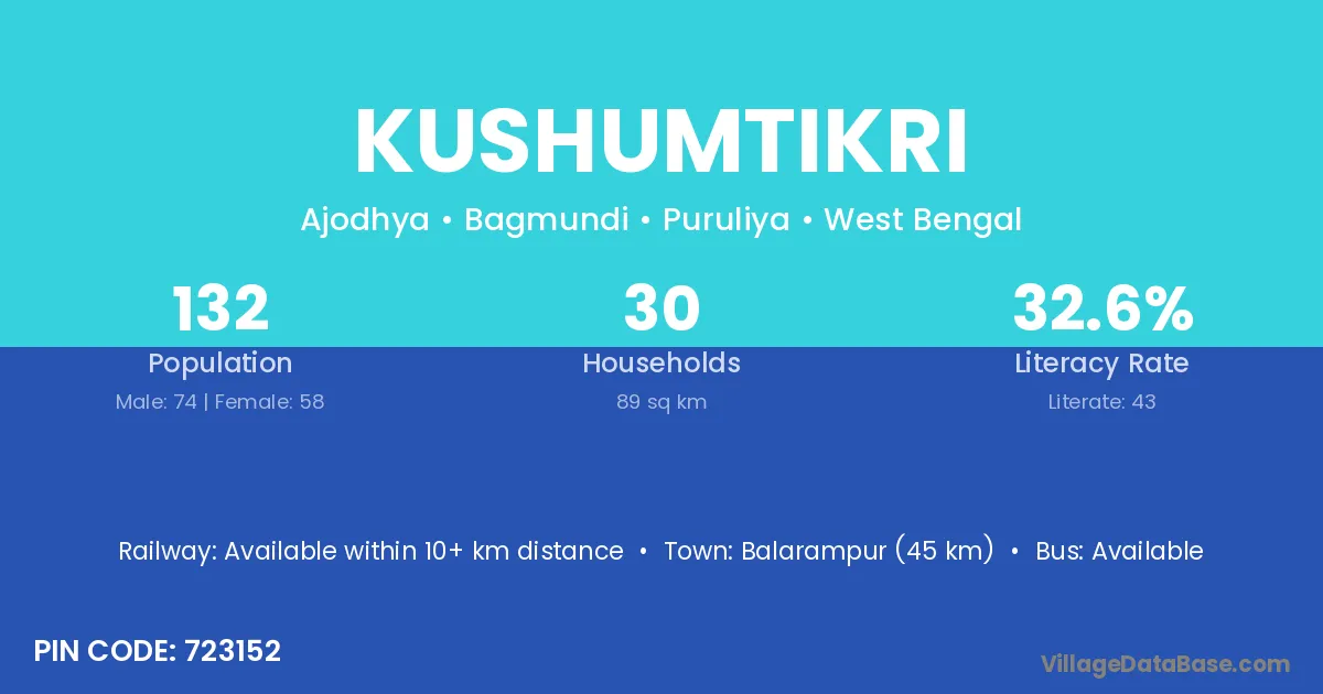 Balarampur (45 km) is the nearest town to Kushumtikri village for major economic activities and is located approximately 45 km away.