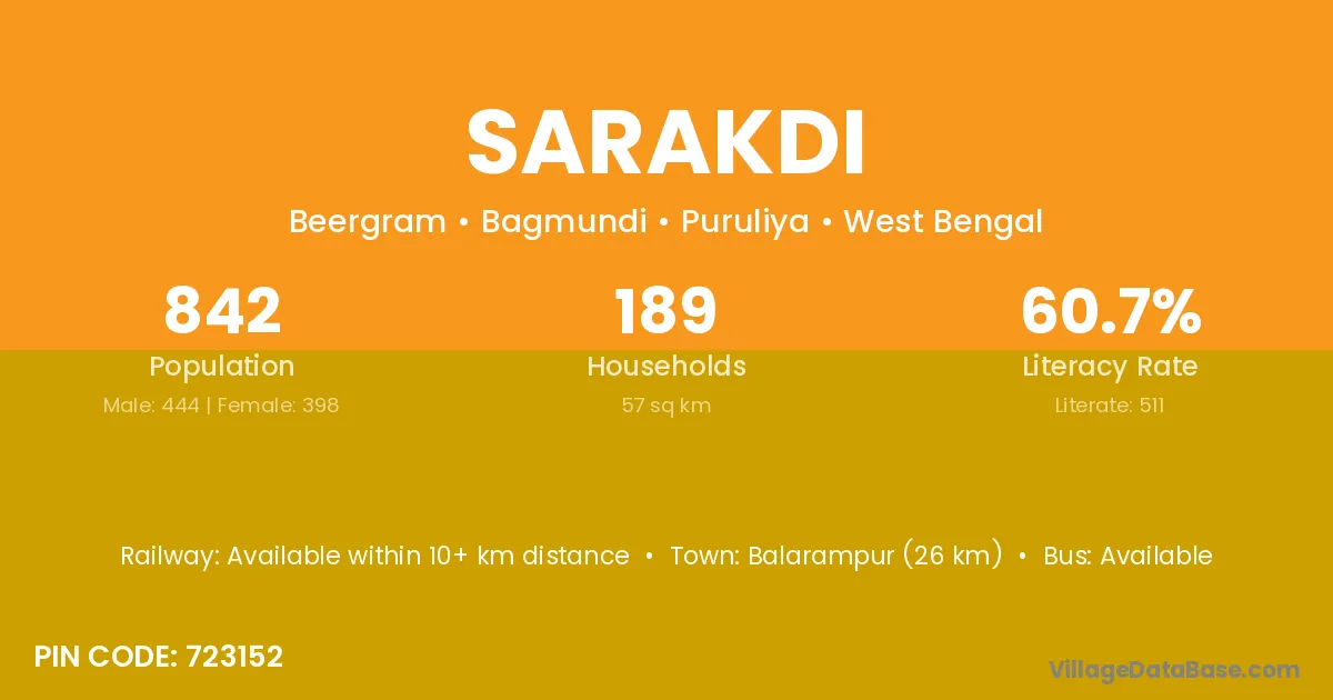 Balarampur (26 km) is the nearest town to Sarakdi village for major economic activities and is located approximately 26 km away.