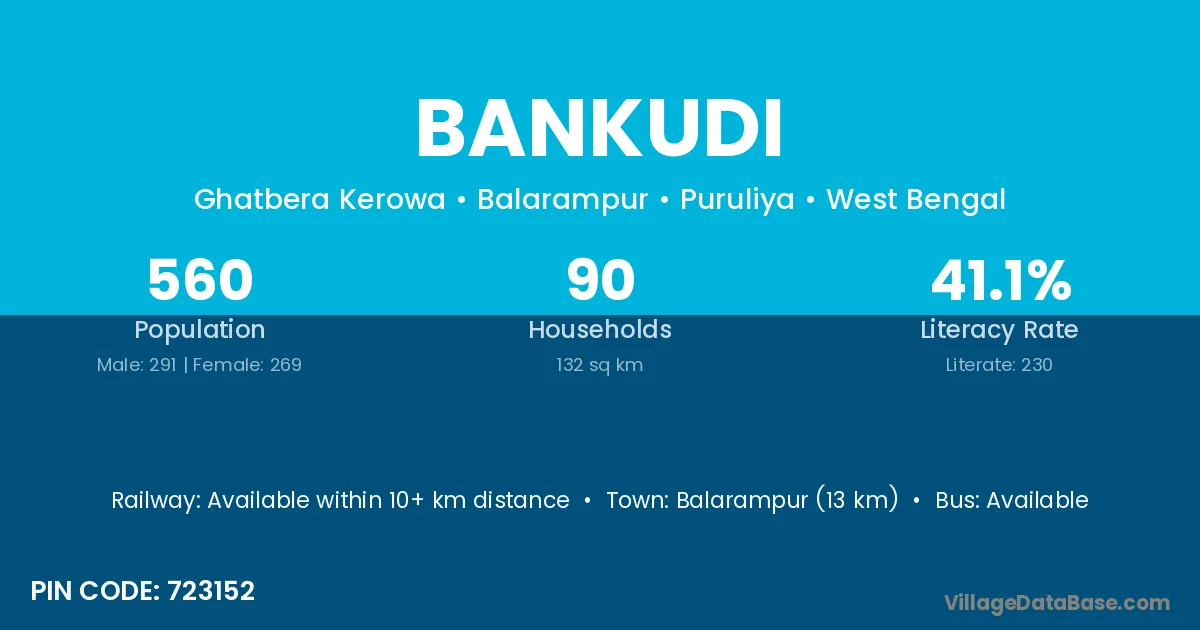 Balarampur (13 km) is the nearest town to Bankudi village for major economic activities and is located approximately 13 km away.