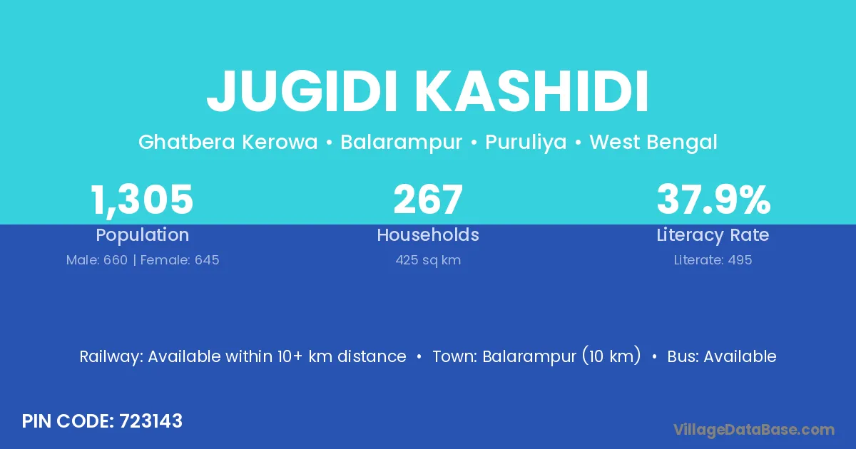 Jugidi Kashidi village has a total population of 1,305 people, of which 660 are males and 645 are females.